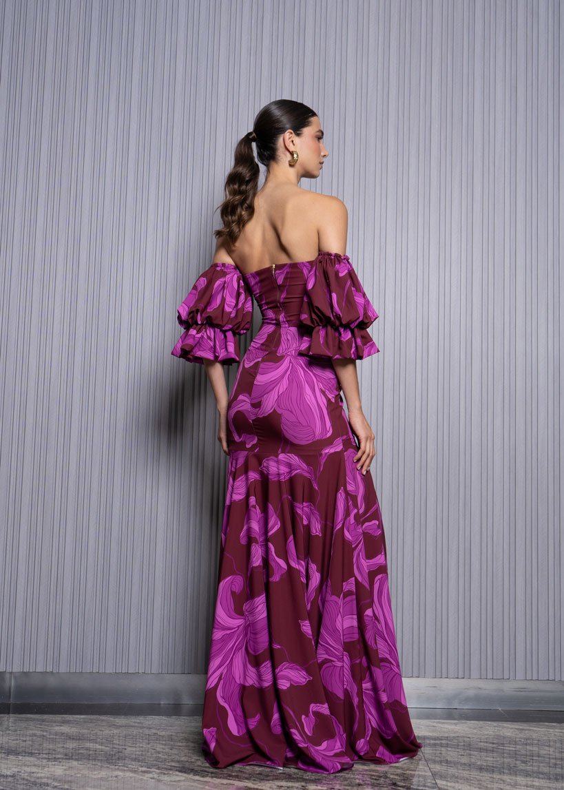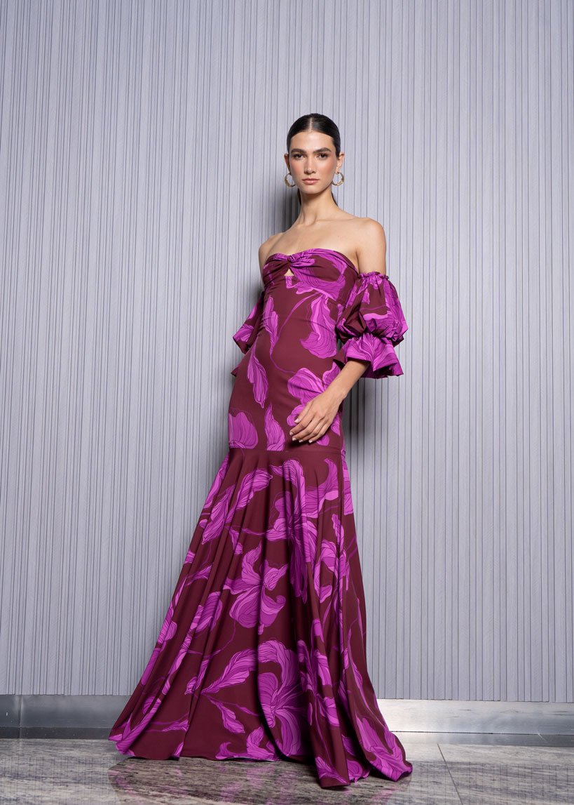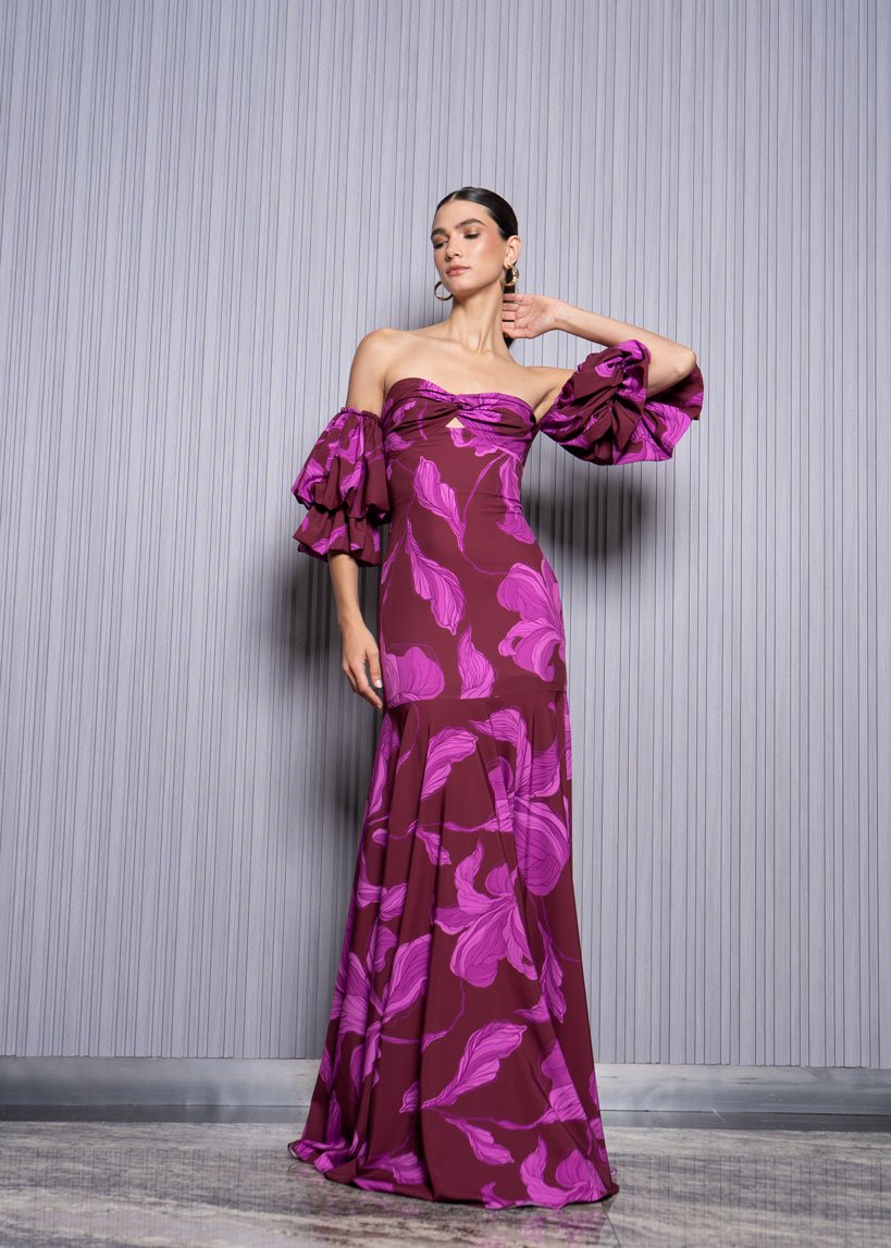 Con un diseño que evoca delicadeza y romanticismo, este vestido cuenta con un escote strapless resaltando los hombros, mientras que las mangas abullonadas añaden glamour y feminidad. La silueta entallada realza los atributos femeninos, y la gola que se despliega aporta volumen y movimiento, creando un look cautivador y lleno de estilo.