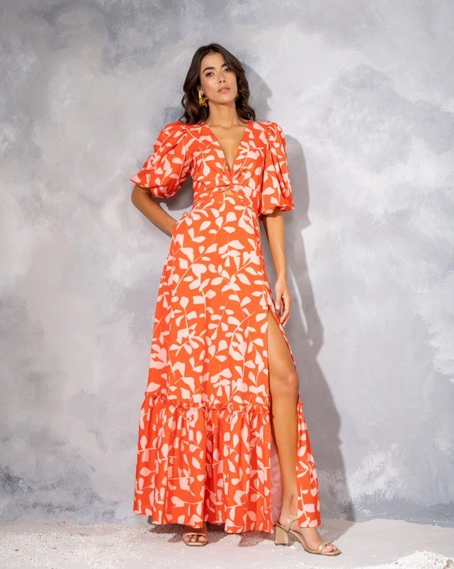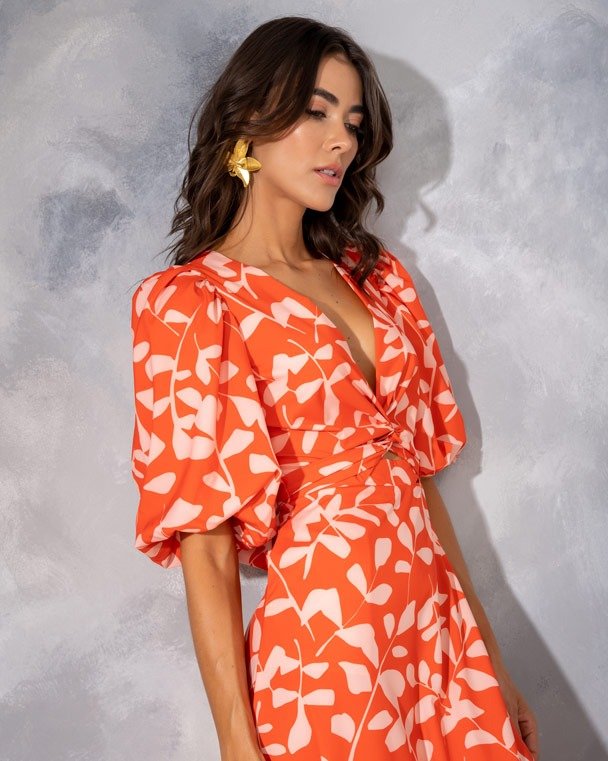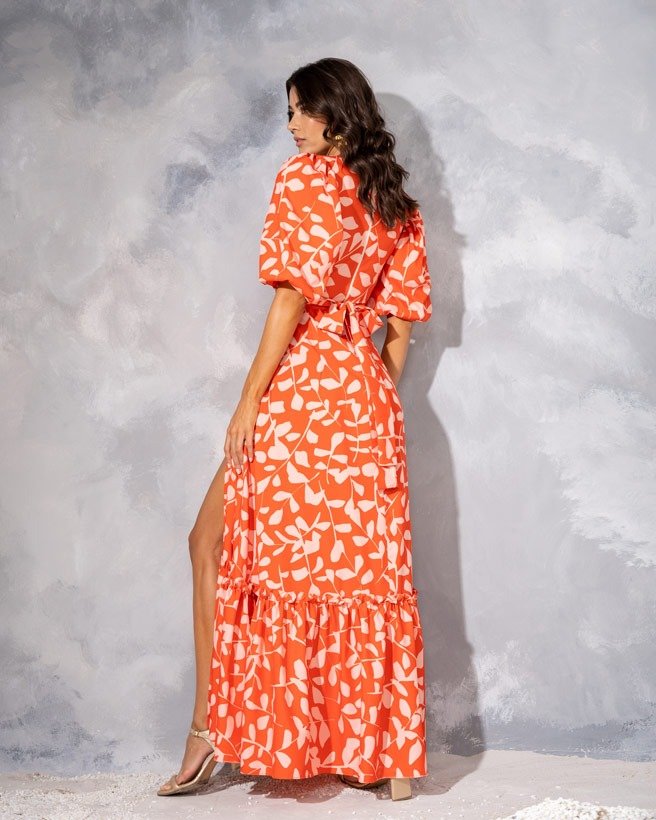 Vestido elaborado en seda estudio mate con delantero de anudar y cruzar, manga puffy con elástico, falda amplia con apertura lateral y detalla de pestaña en bolero, cremallera en el centro de la espalda.