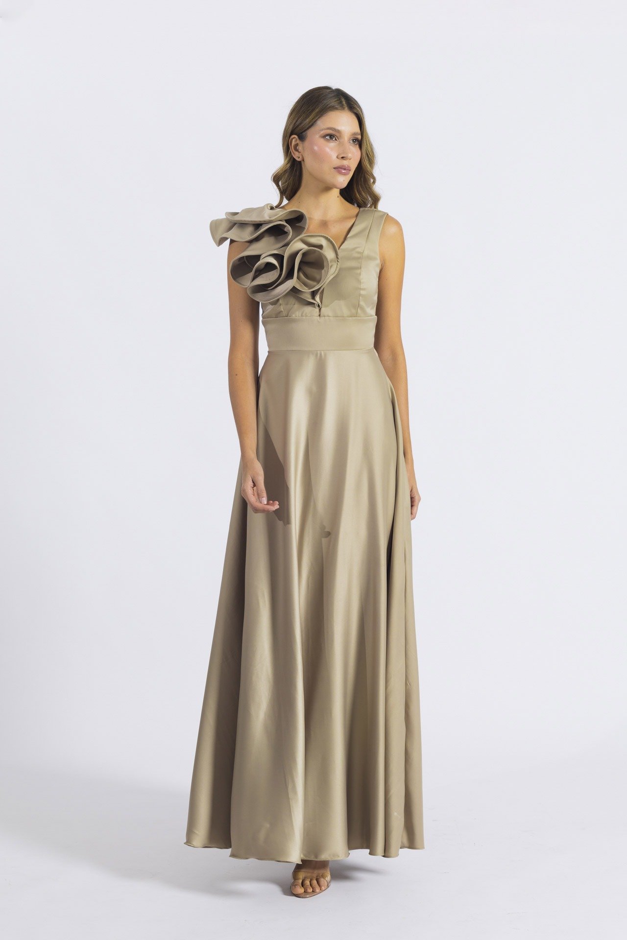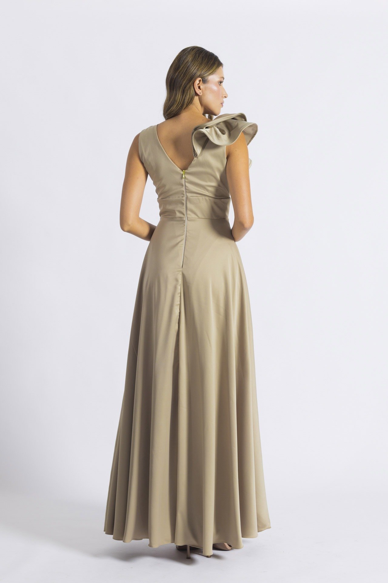 El Vestido Noelia largo color ostra combina elegancia y movimiento en una silueta que realza la feminidad. Su escote en V profundo con delicada malla color piel y los boleros en una manga aportan textura y volumen. La pretina amplia define la cintura y da paso a una maxi falda fluida, perfecta para ceremonias, eventos especiales o celebraciones importantes.
