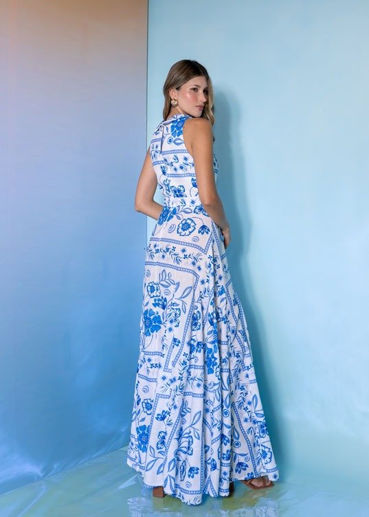 Vestido elaborado en lino, cuello bebe con delantero ceñido, falda de corte rotondo forrada con bolsillos laterales, espalda con botón y cremallera central.