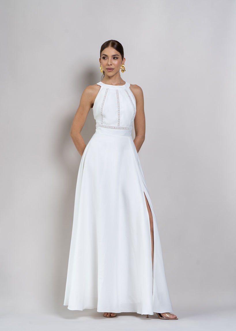 Nuestro vestido Pegasus destaca por sus detalles cuidadosamente elaborados, perfecto para ti que buscas un estilo femenino y delicado. Su escote redondo y apliques de encaje, su hermosa espalda de anudar y la abertura de su falda son detalles que hacen de este vestido una pieza sinónimo de elegancia y romanticismo atemporal. Úsalo con unas delicadas sandalias de tacón y accesorios dorados para tu momento especial o combínalo con un calzado plano para tus looks diarios.