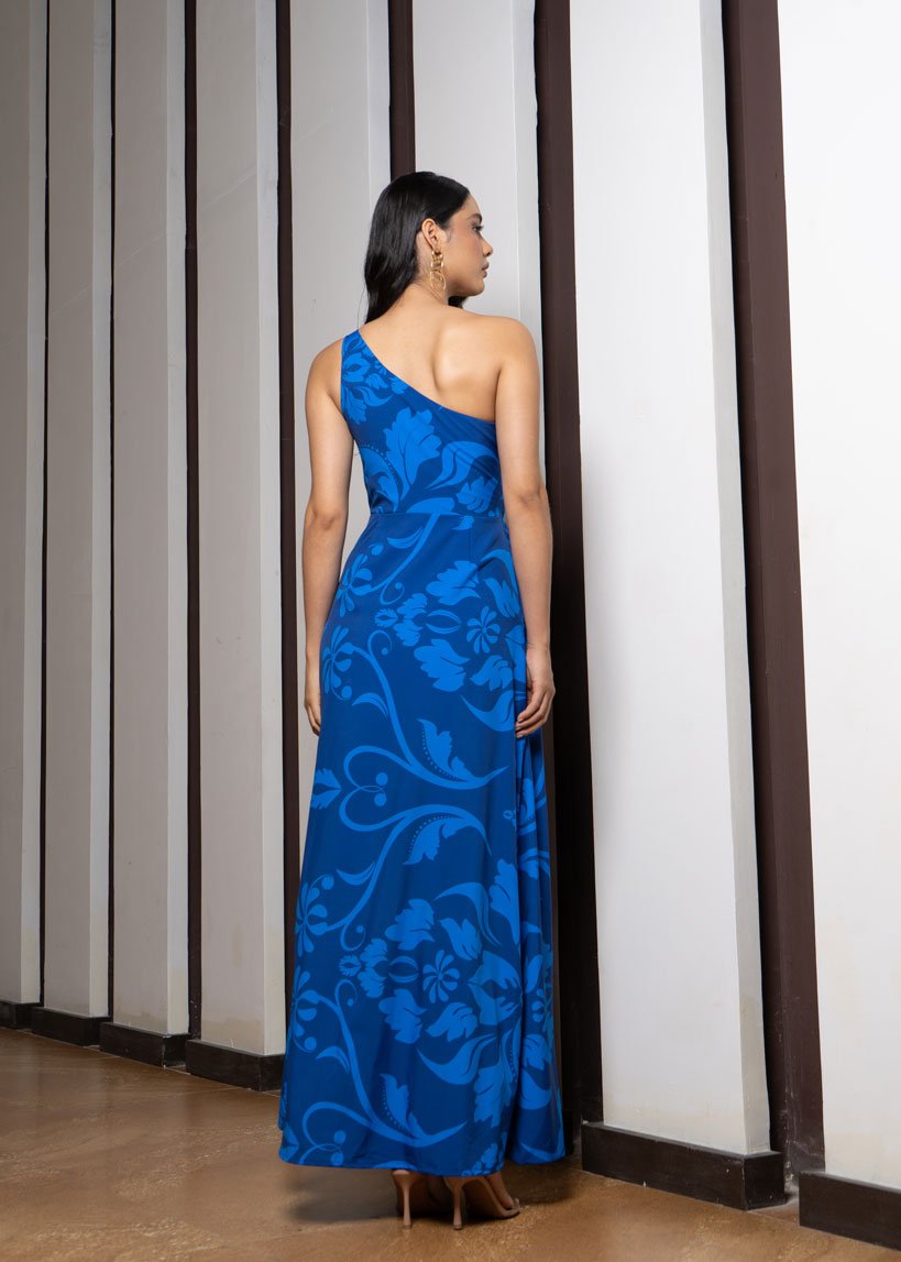 Vestido elaborado en seda estudio mate, escote medio beso, delantero con detalle fruncido en lateral falda amplia doble con abertura y cremallera en el centro de la espalda.