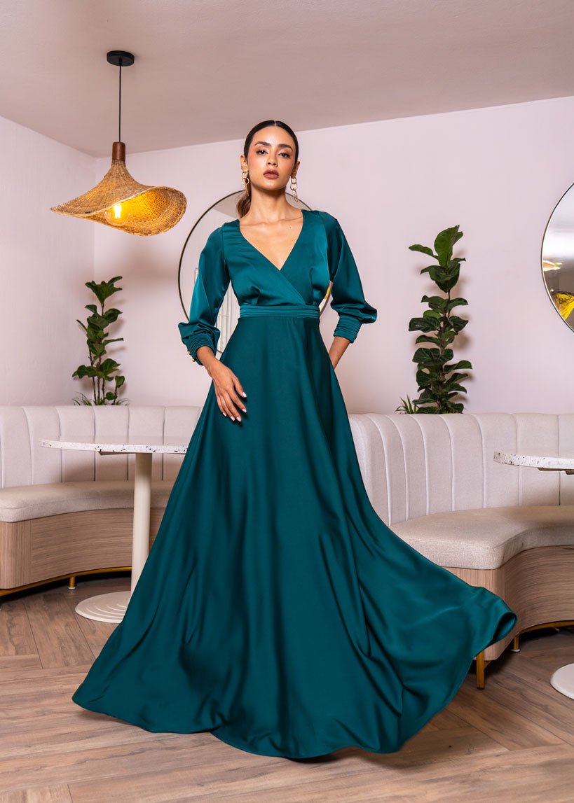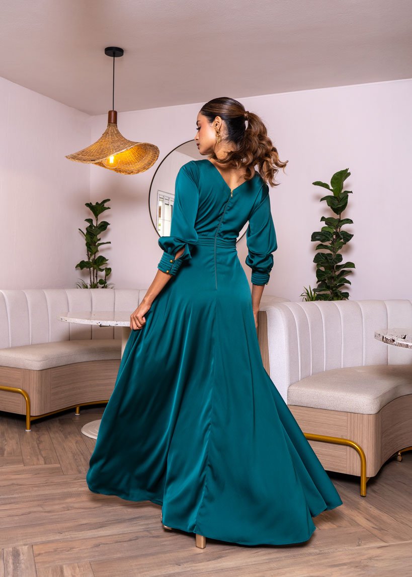 Vestido elaborado en seda con liguero brillo, manga larga con detalle de alforzas en puño y en cintura, falda semirotonda y cremallera en el centro de la espalda.