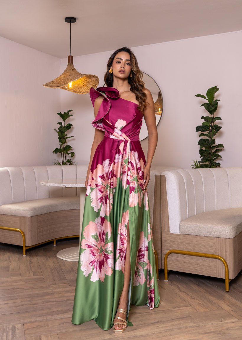Este vestido elaborado en seda satinada es una declaración de estilo y originalidad, ideal para quienes buscan destacar con elegancia. Su escote asimétrico y boleros en un solo hombro, juega con las formas y volúmenes, mientras que la cola de caballo en el borde de los boleros aporta cuerpo y estructura, realzando la silueta con delicadeza.