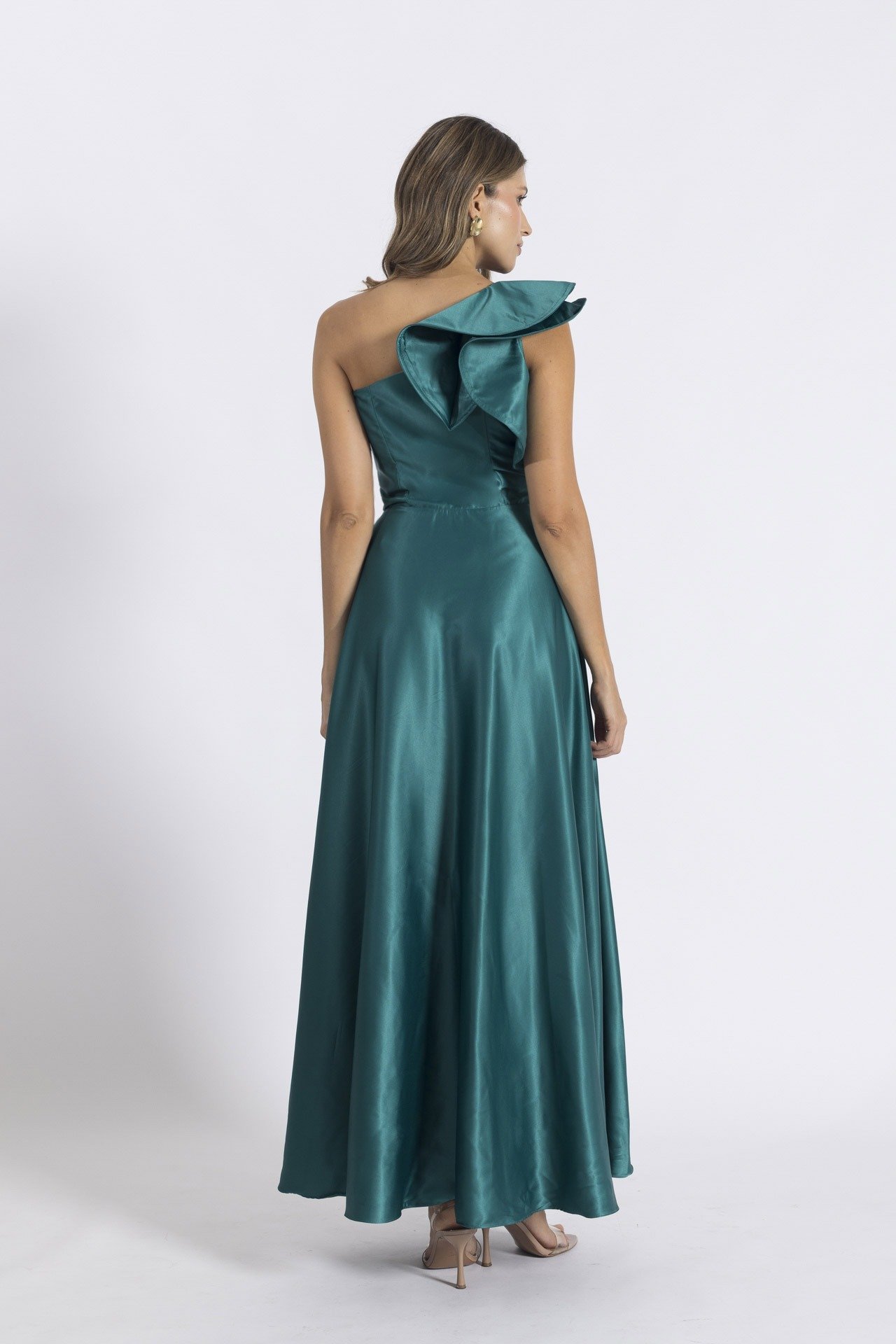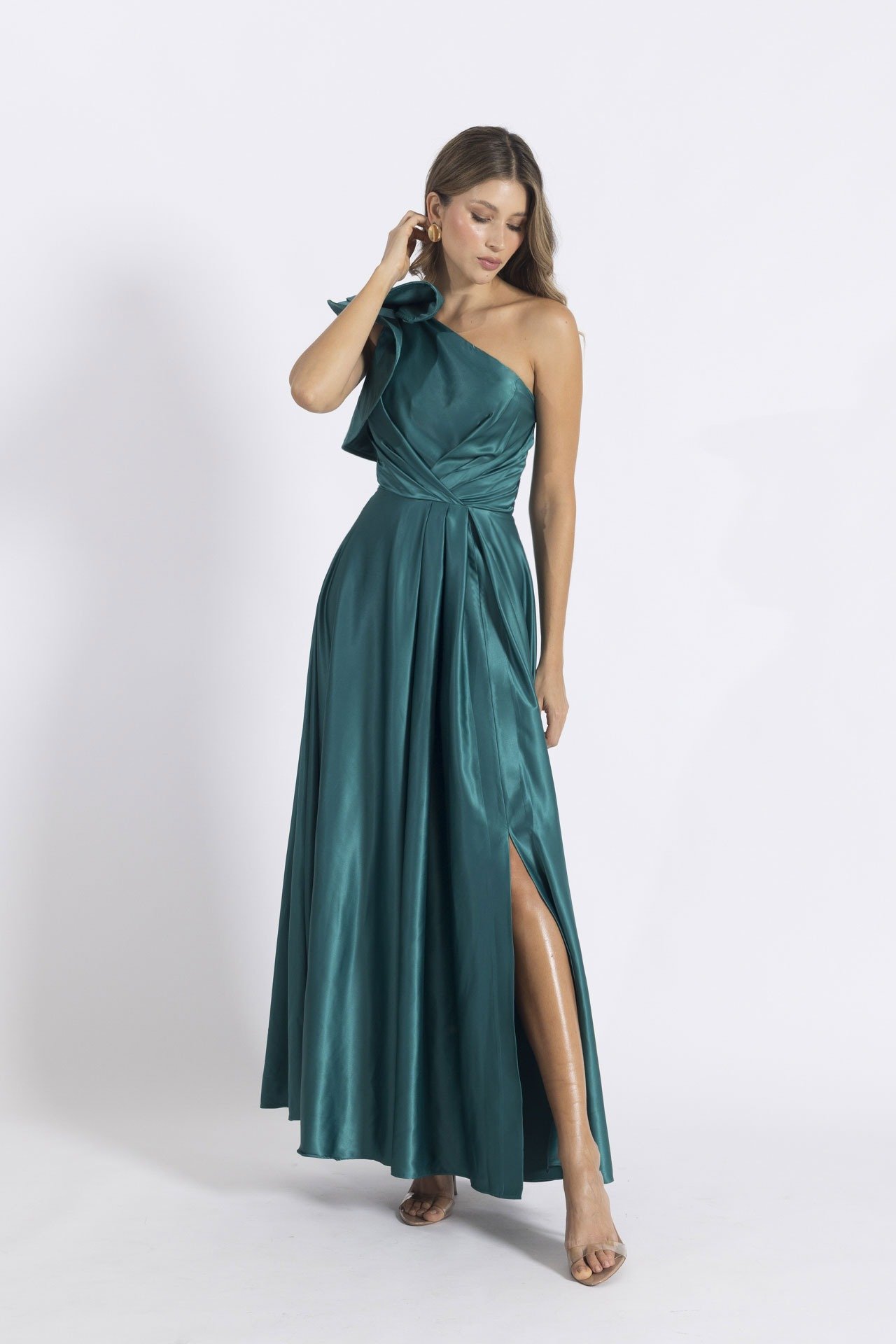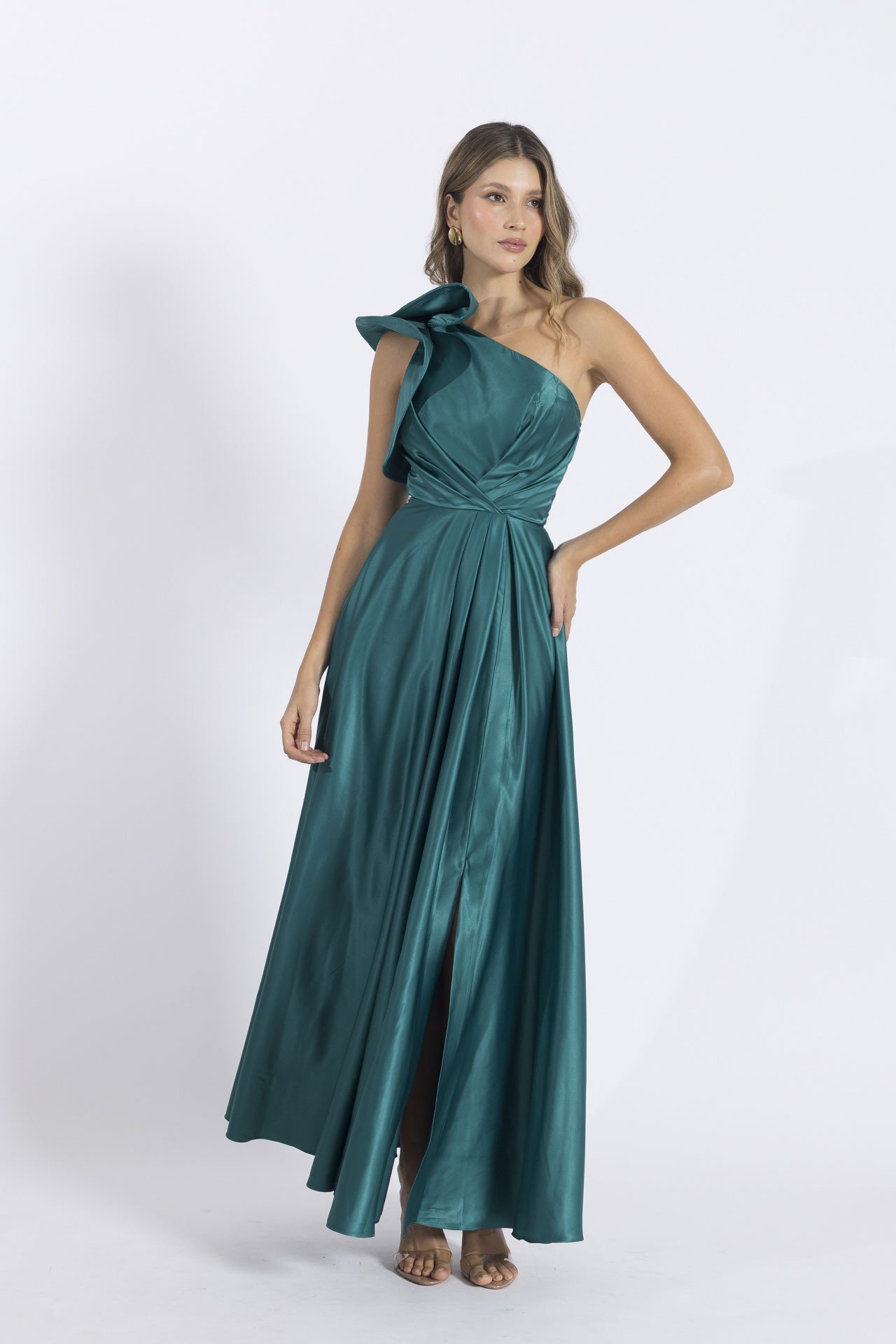 Este vestido elaborado en seda satinada es una declaración de estilo y originalidad, ideal para quienes buscan destacar con elegancia. Su escote asimétrico y boleros en un solo hombro, juega con las formas y volúmenes, mientras que la cola de caballo en el borde de los boleros aporta cuerpo y estructura, realzando la silueta con delicadeza.El detalle drapeado y la abertura en la falda añaden un toque de sensualidad sutil y movimiento, logrando una armonía perfecta entre sofisticación y frescura.Una elección perfecta para eventos especiales donde quieras lucir única, elegante y absolutamente inolvidable.