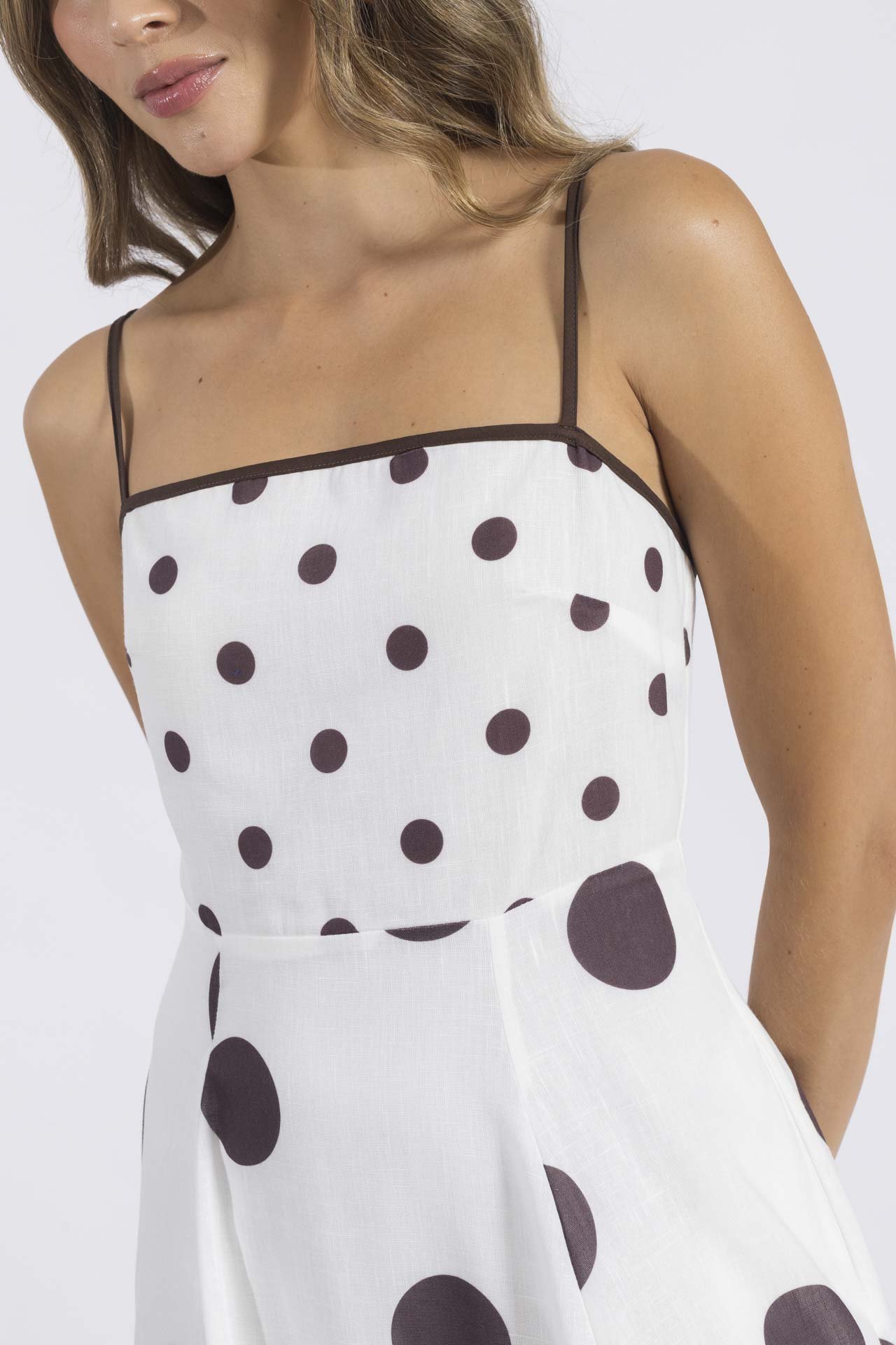 Moderno y lleno de encanto, el vestido Sabrina combina puntos en contraste de tamaños para crear un estampado único y llamativo. Su diseño vanguardista lo hace ideal para un evento al aire libre, una salida con amigas o para destacar en tu día a día con un look fresco y con estilo. Cuenta con bolsillos.
