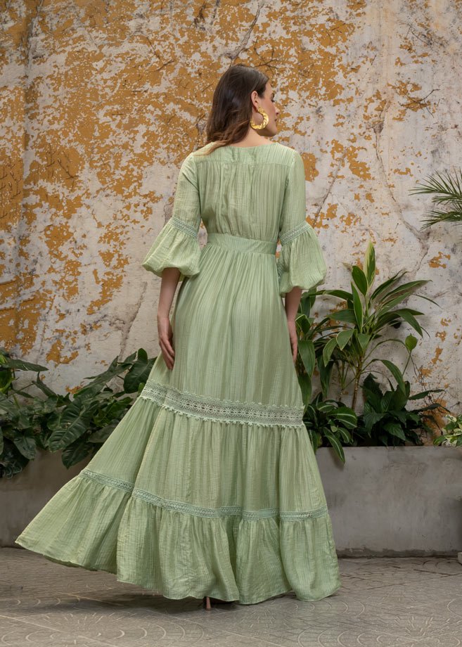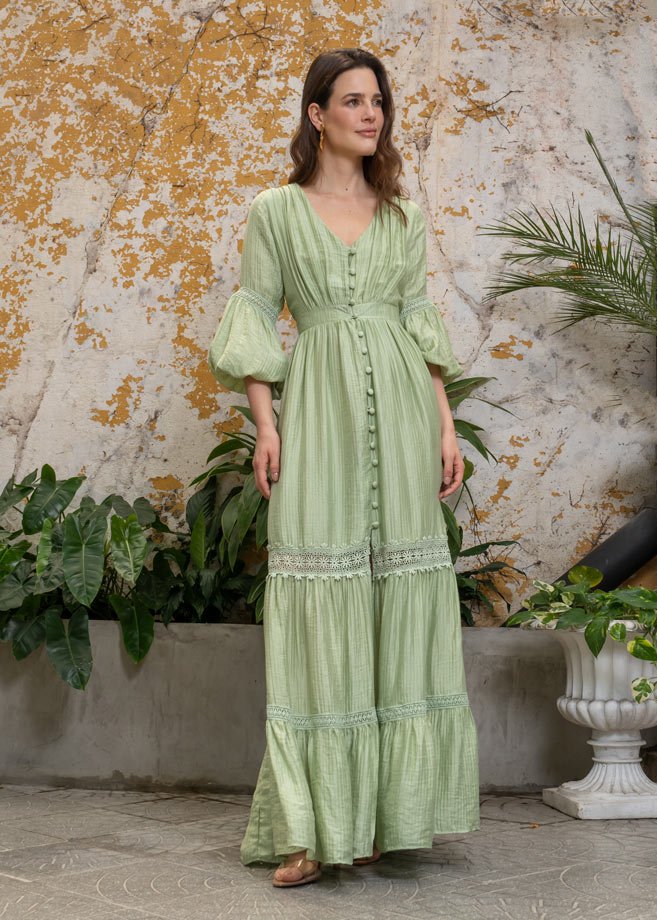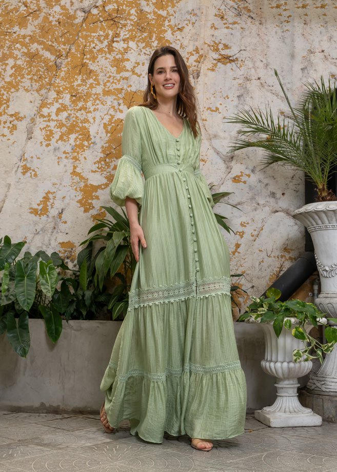 Este vestido es una invitación a fluir con elegancia y naturalidad. Confeccionado en una tela liviana y delicadamente texturizada, su sutil brillo aporta luminosidad sin perder suavidad. Los detalles de encaje en mangas y falda realzan su carácter artesanal y femenino, mientras que los botones forrados al tono recorren el frente como un acabado delicado que completa su estética bohemia. Su silueta fluida y vaporosa lo convierte en una pieza ideal para ocasiones especiales de día, escapadas al aire libre o momentos donde la comodidad y el estilo se encuentran en perfecta armonía.