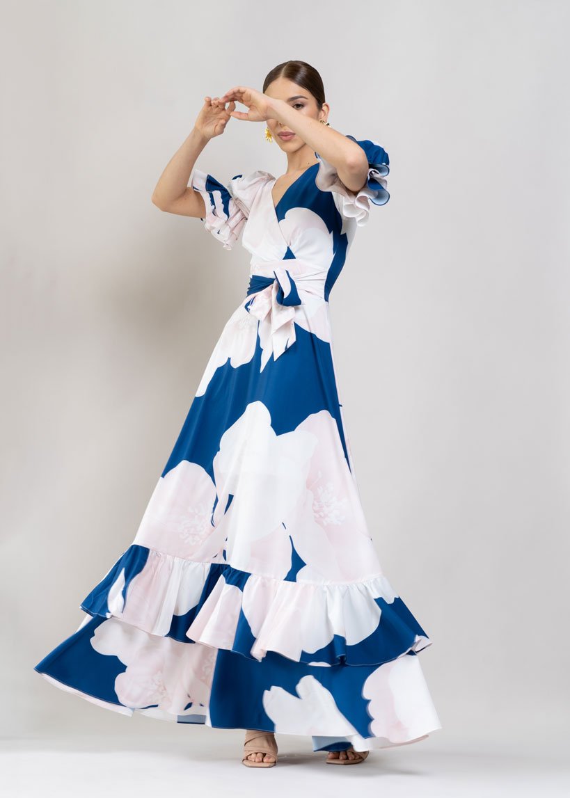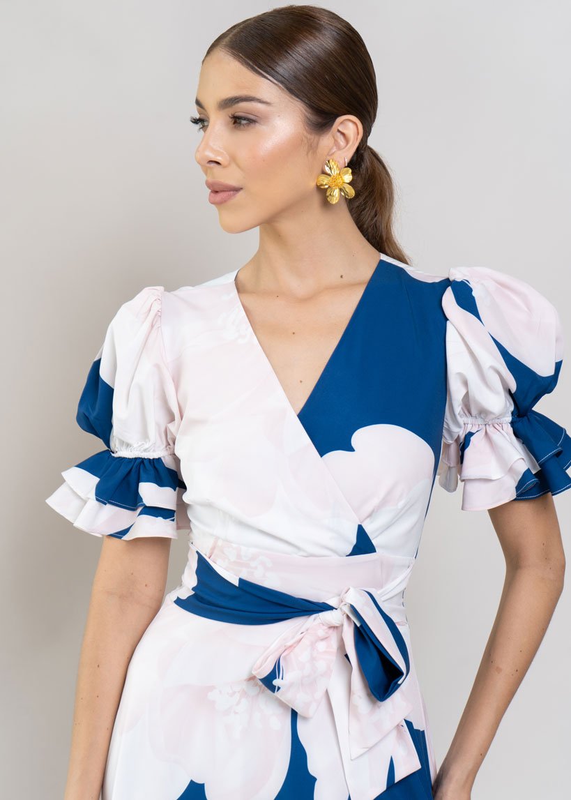 Llega nuestro icónico vestido Tatiana en un estampado que amaras, su silueta te hará sentir muy cómoda y linda en tus eventos o en tu día a día. Maxivestido con escote cruzado, mangas bombachas y falda con boleros. Es perfecto para ocasiones semiformales como una comida con tus amigas o esa reunión en la que no deseas pasar desapercibida. Úsalo con sandalias de tacón y atrévete a más con unos aretes grandes dorados.