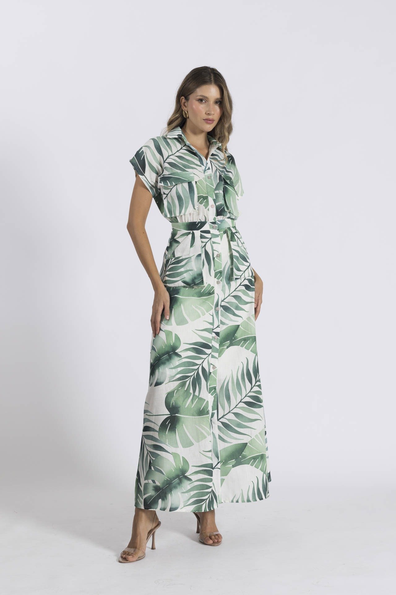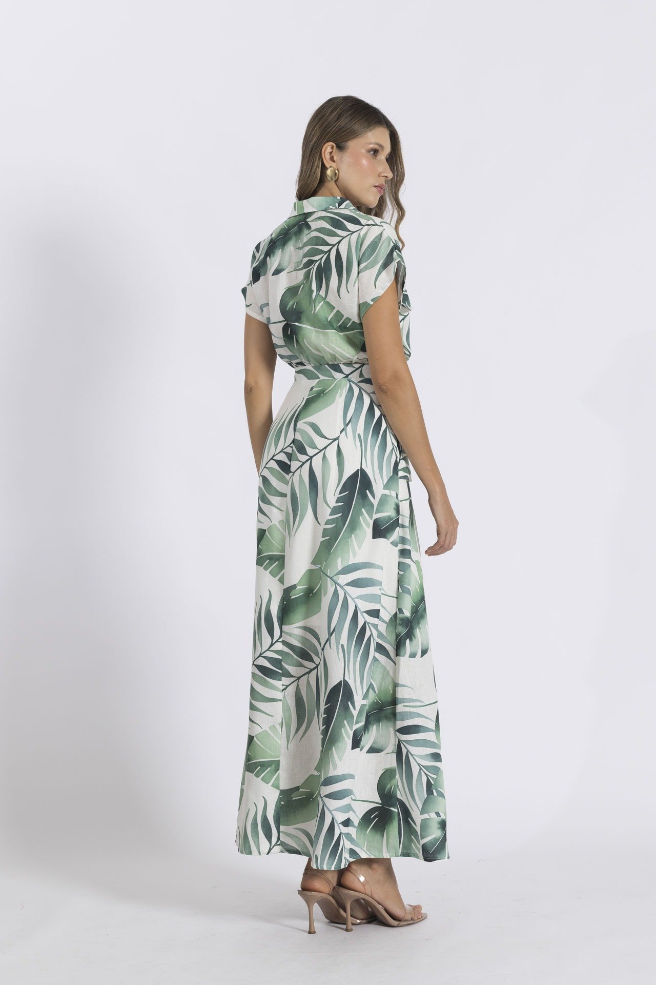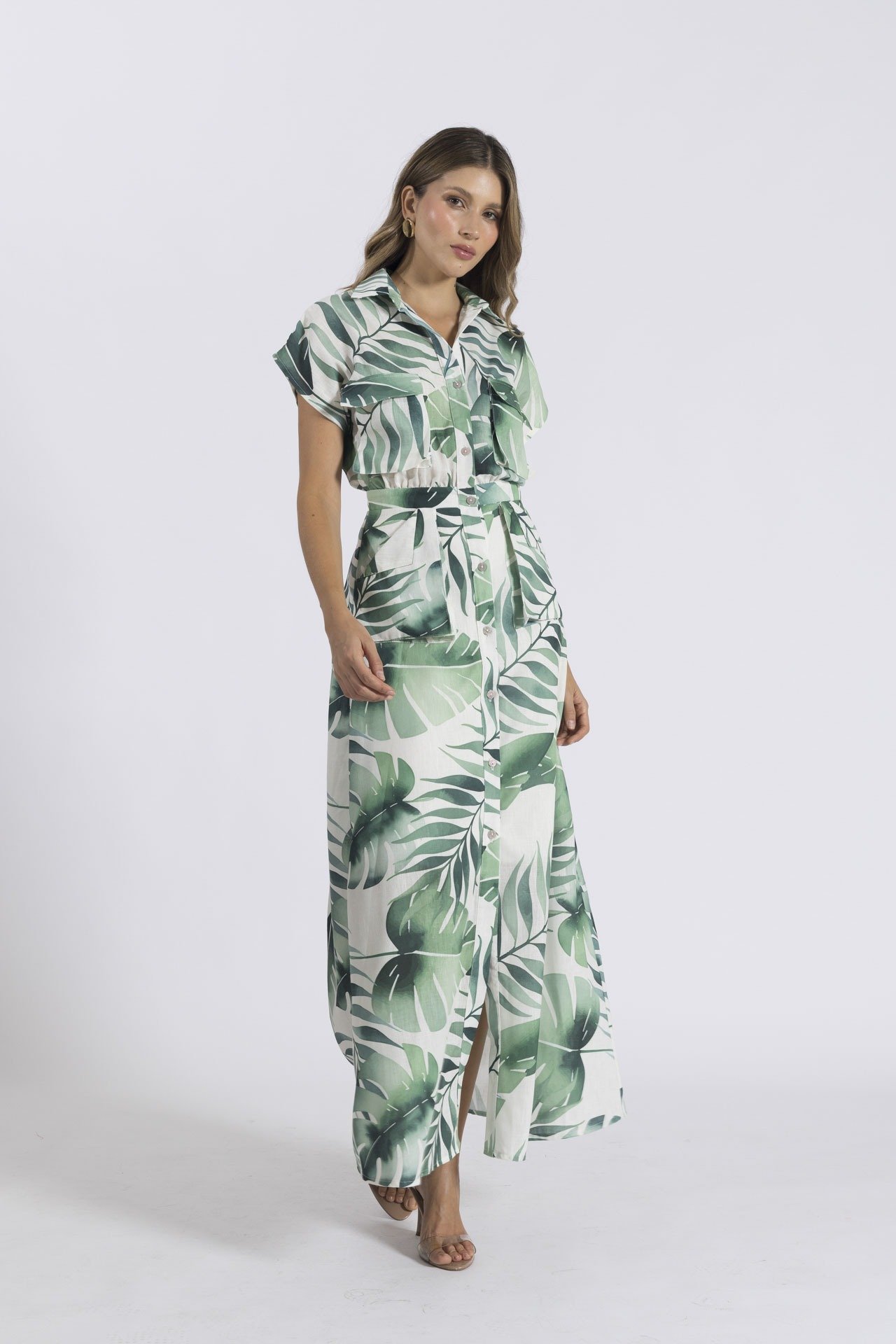 Vestido elaborado en lino estampado con forro, bolsillos y botonera central funcionales.