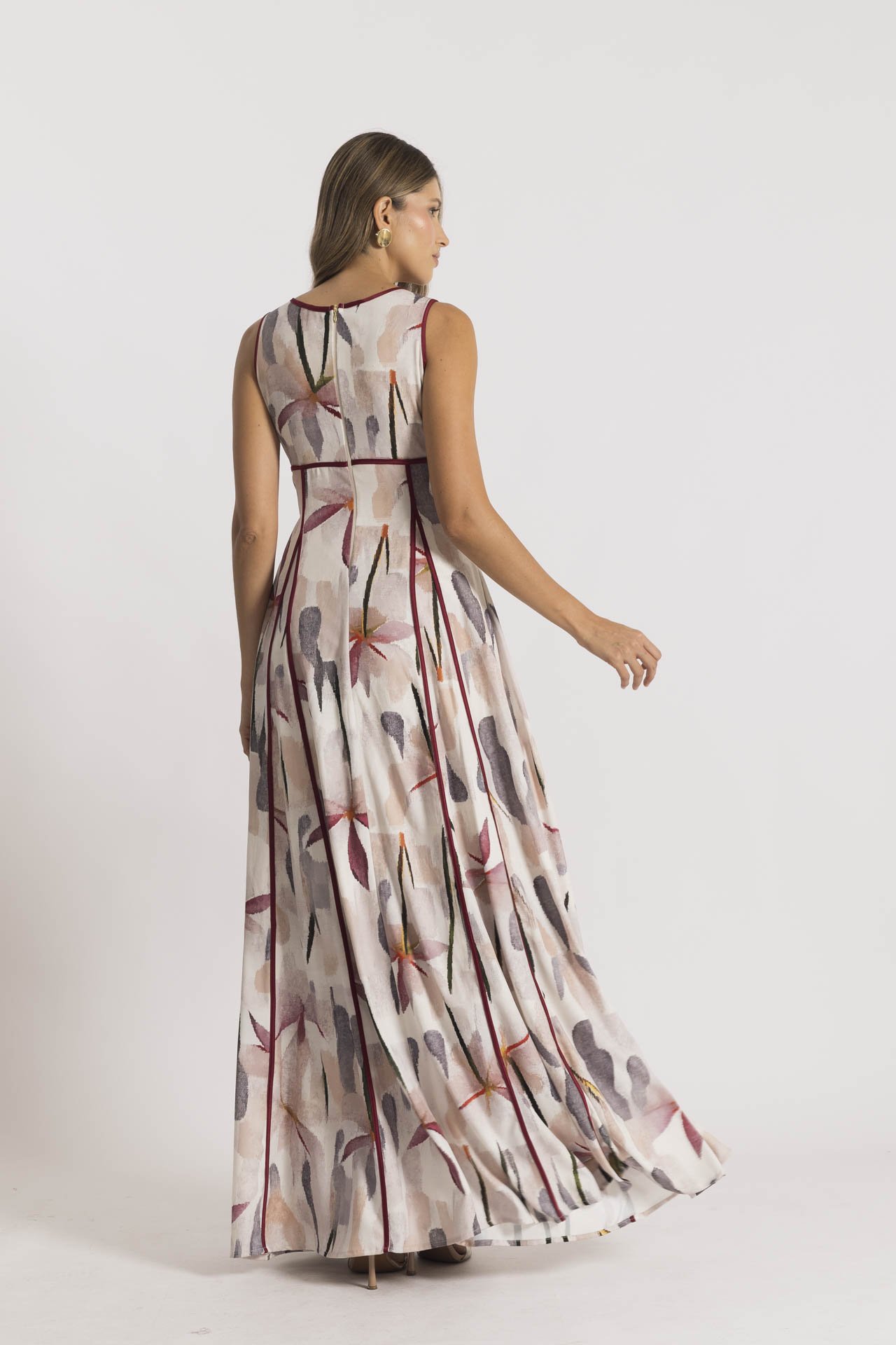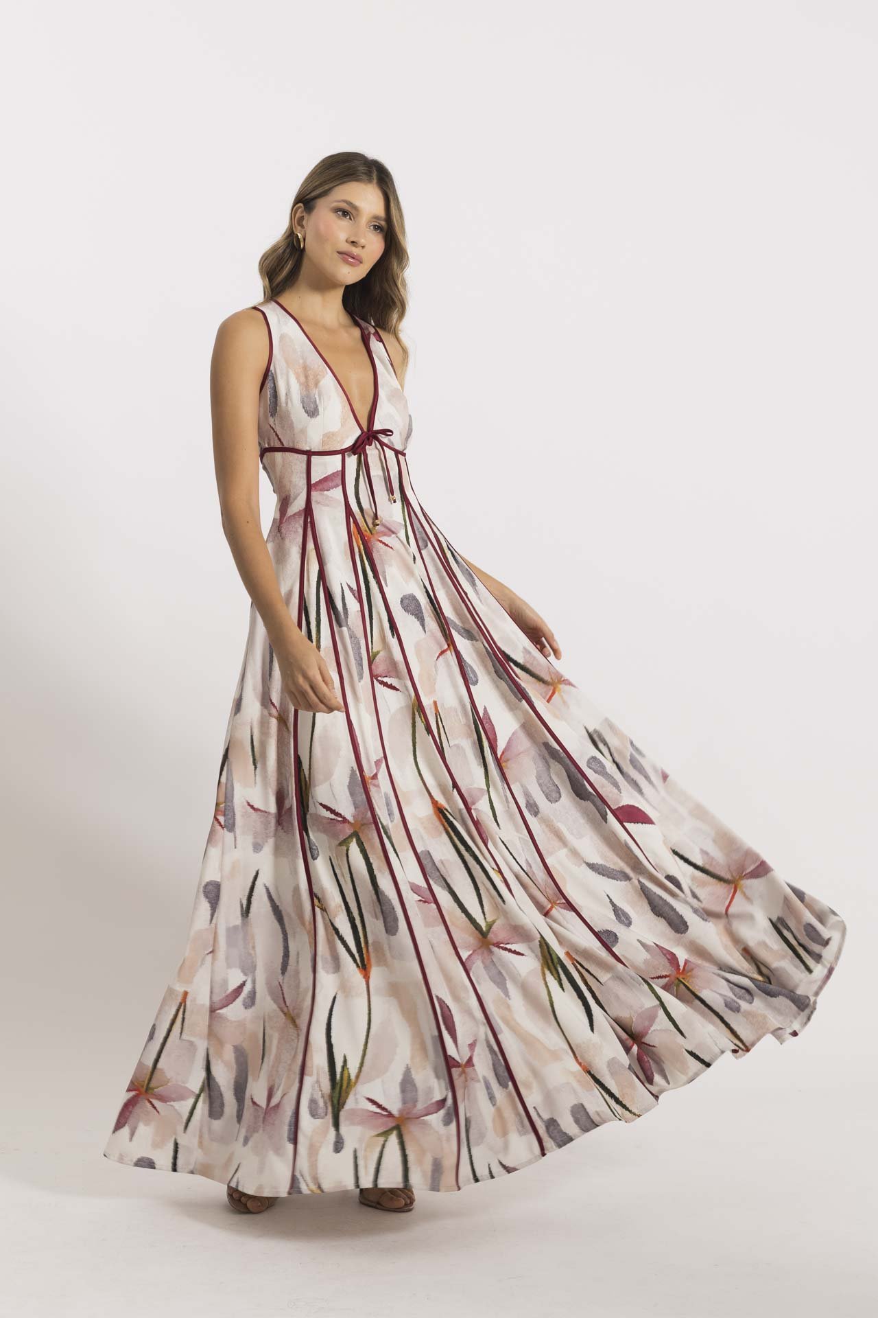 El Vestido Versalles largo en estampado floral presenta un diseño con cortes en nesgas decoradas con sesgos en tono contrastante, que aportan un impacto visual moderno y atractivo. Su silueta amplia lo hace cómodo y femenino, ideal para un date en un pueblito, una cena al aire libre o un evento casual.