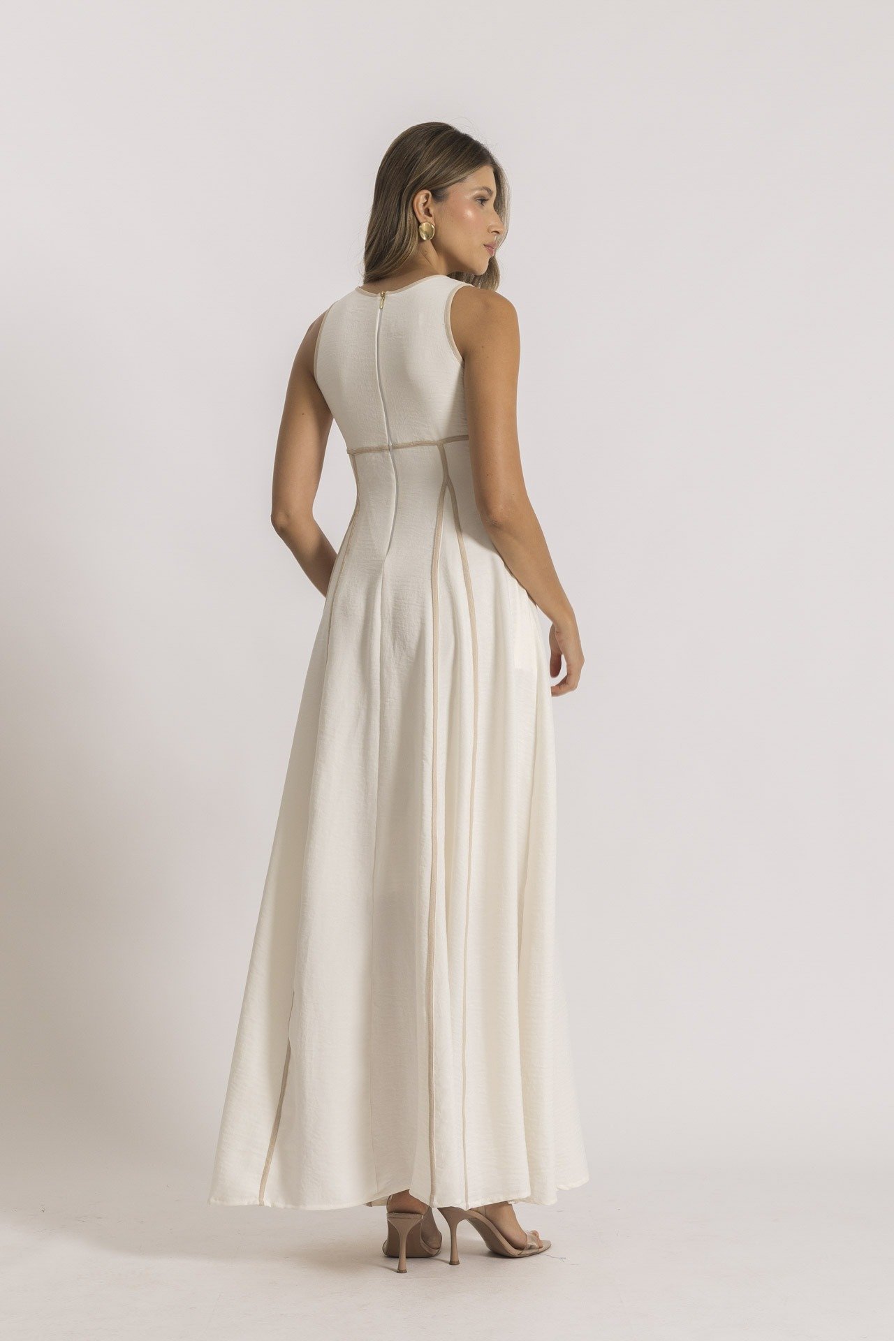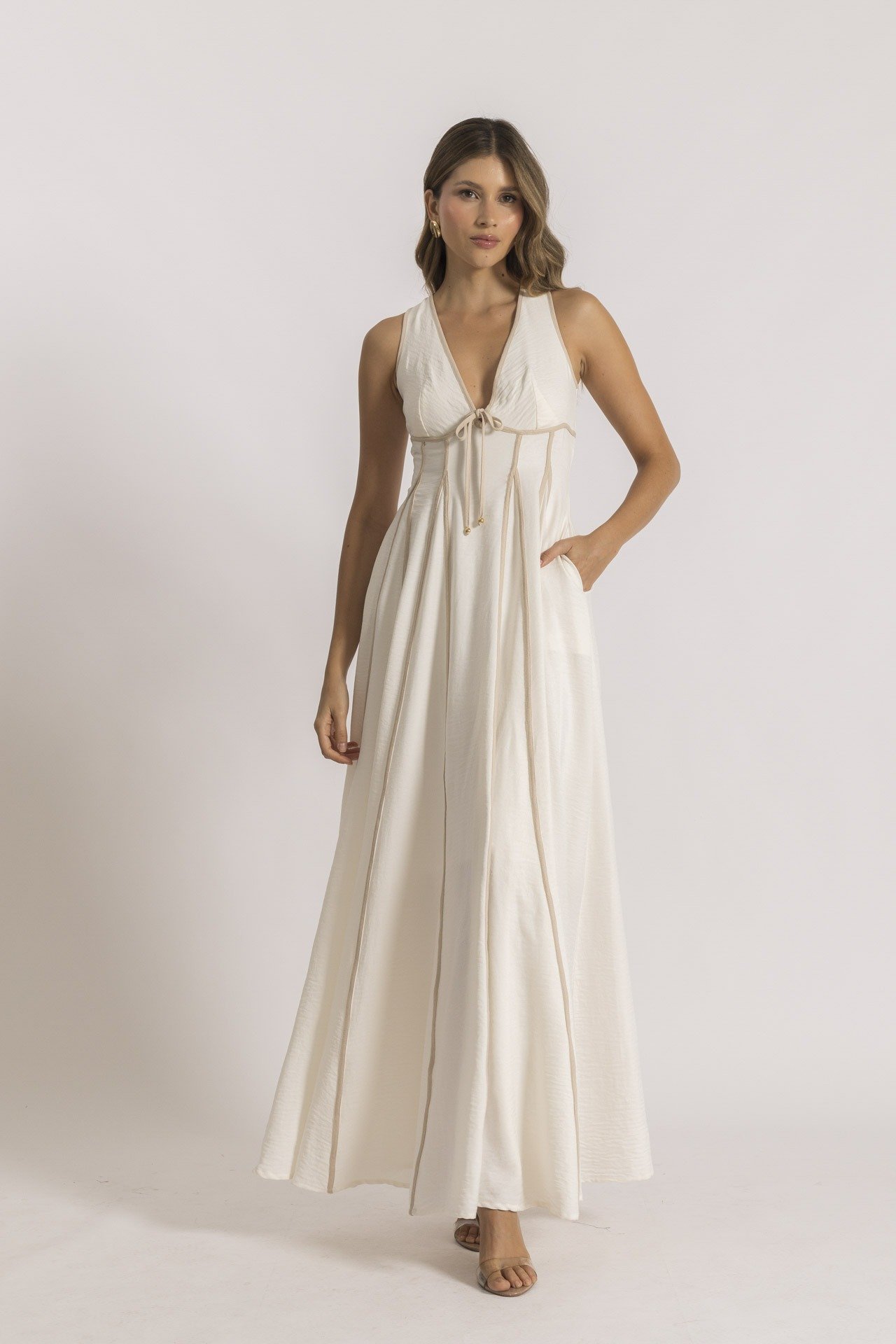 El Vestido Versalles largo color marfil presenta un diseño con cortes en nesgas decoradas con sesgos en tono contrastante, que aportan un impacto visual moderno y atractivo. Su silueta amplia lo hace cómodo y femenino, ideal para un date en un pueblito, una cena al aire libre o un evento casual.