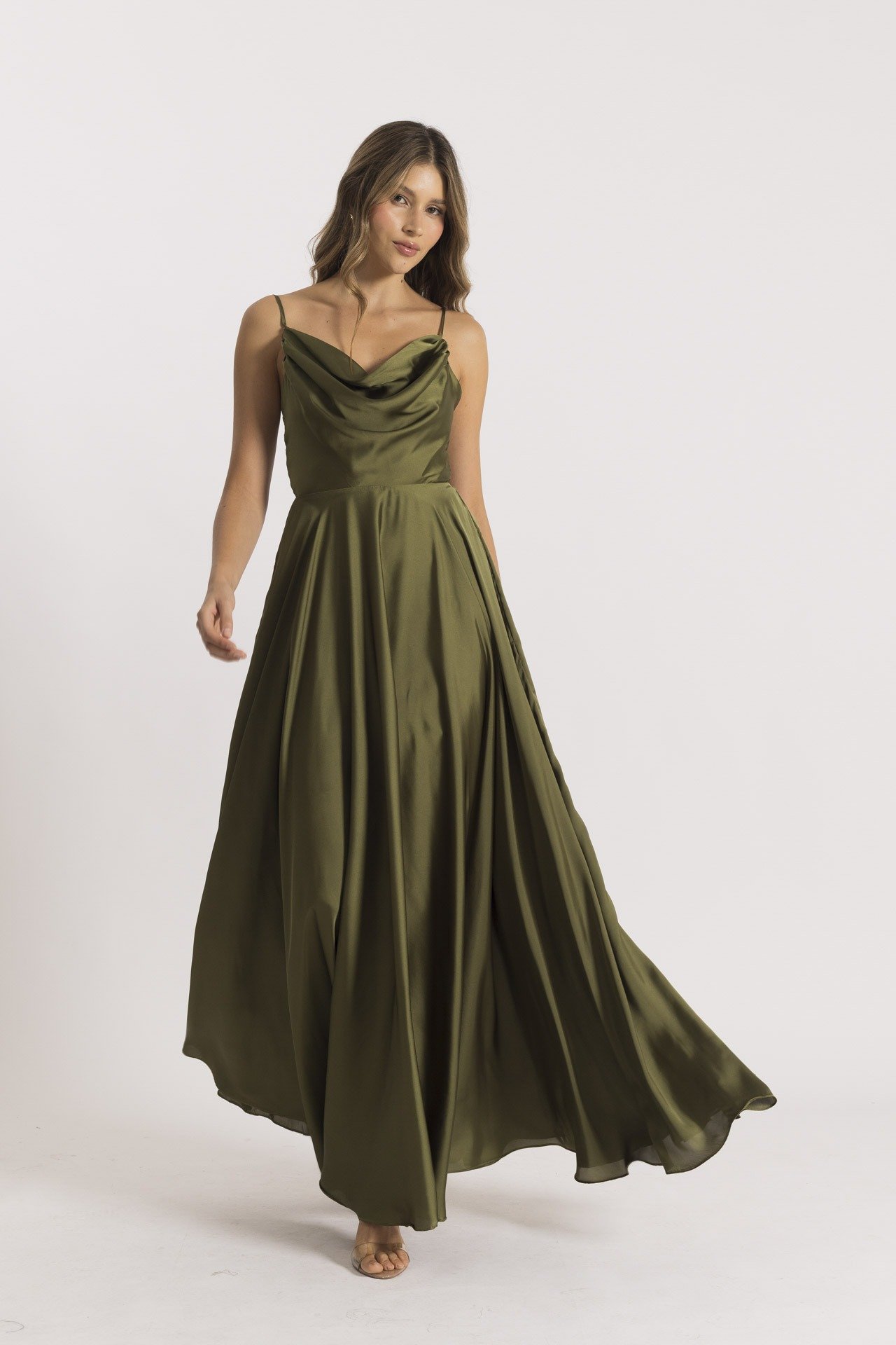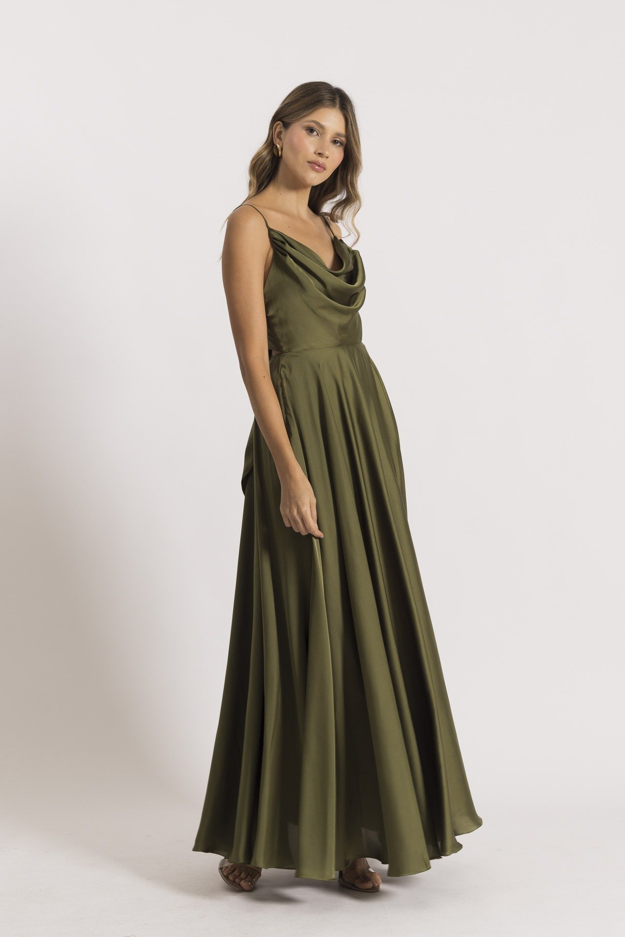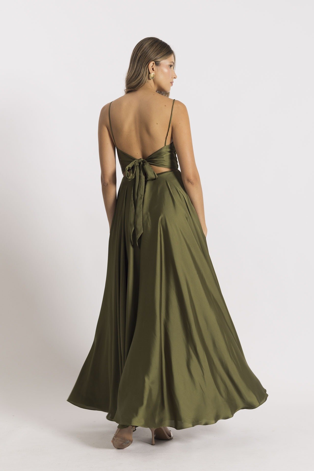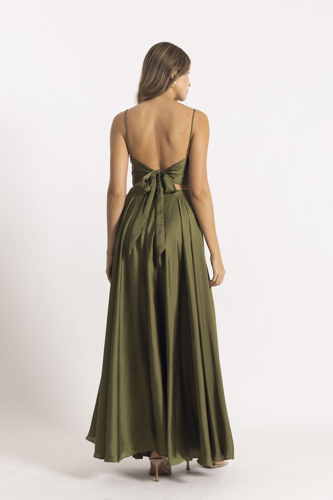 El vestido Zafiro verde oliva cuenta con un escote drapeado creando un efecto visual encantador, mientras que el escote en la espalda, la parte más llamativa se anuda con un moño adaptándose perfectamente a tu cuerpo.