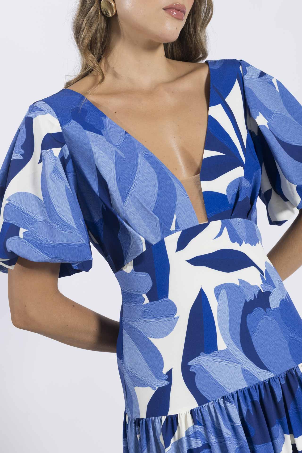 El vestido Zaira azul destaca por su escote en V acompañado de una delicada malla color piel, mangas abullonadas y una falda compuesta por bloques de golas fruncidas que aportan textura, movimiento y carácter. Una elección perfecta para invitadas de boda o eventos elegantes donde quieras destacar con estilo.